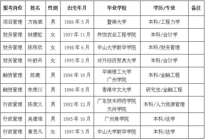 根據(jù)揭陽(yáng)市投資控股集團(tuán)有限公司的委托,我公司經(jīng)組織報(bào)名、資格審查、筆試、面試、體檢、政審等程序,現(xiàn)確定下列人員為揭陽(yáng)市投資控股集團(tuán)有限公司擬聘用人員并公示如下: